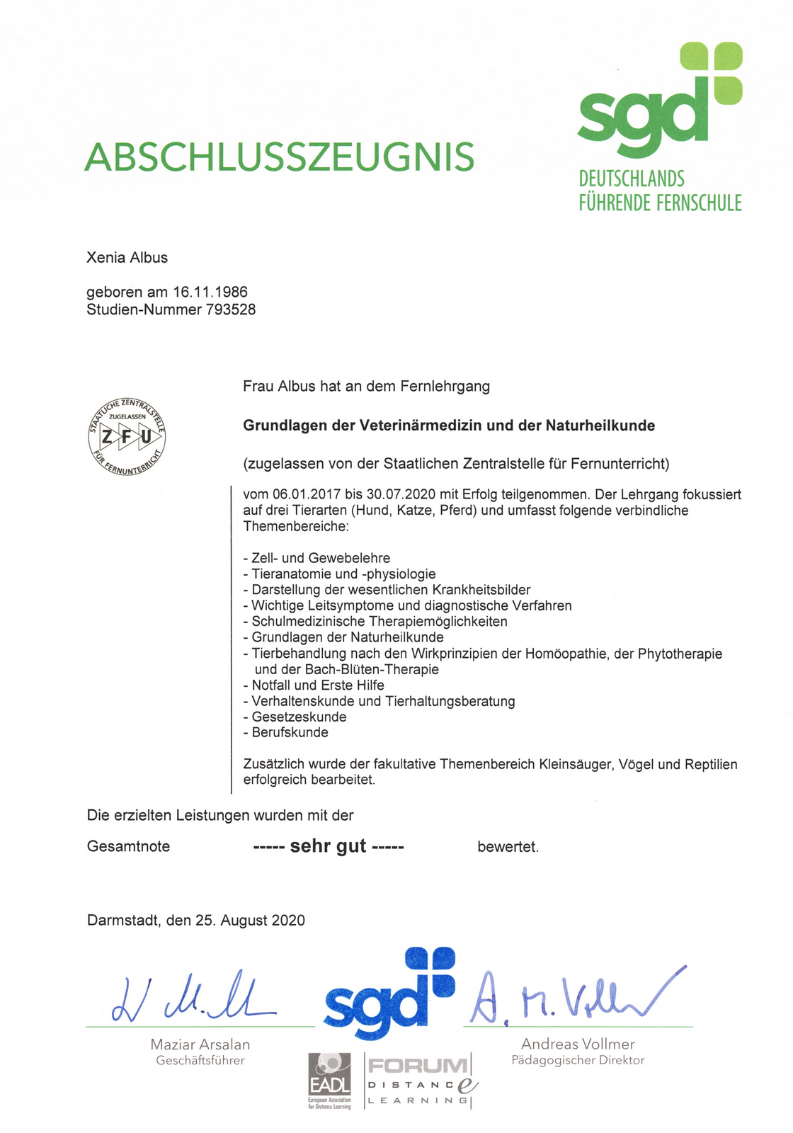 Abschlusszeugnis Tierheilpraktiker - August 2020