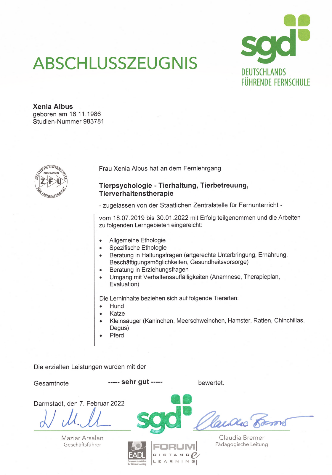 Abschlusszeugnis Tierpsychologie - Februar 2022